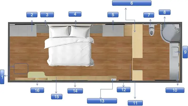 | نظام المياه والصرف الصحي | مدخل مياه للمخيم (تحت الشاسية) أنابيب مياه عذبة PPR (20 مم)، أنابيب مياه الصرف الصحي PVC (50 مم)، وأنابيب مياه الصرف الصحي (110 مم) | |